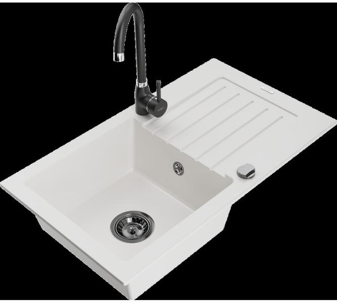 Elias konyhai mosogató, 795x480x200 mm, 1 kamrás Gyártó: Mexen Sorozat: Elias Típus: 1 kamrás, rövid csepegtetővel Méretek: 795x480x200 mm Kamra mélysége: 190 mm Kamra méretei: 465x420 mm Lefolyó átmérője: ø90 mm Beépítés: felülről a munkalapba süllyesztve Anyaga: gránit (80% gránit adalékanyag 20% gyanta) Túlfolyó lyuk: igen Lyukak: 2 (1 x akkumulátor, 1 x autom