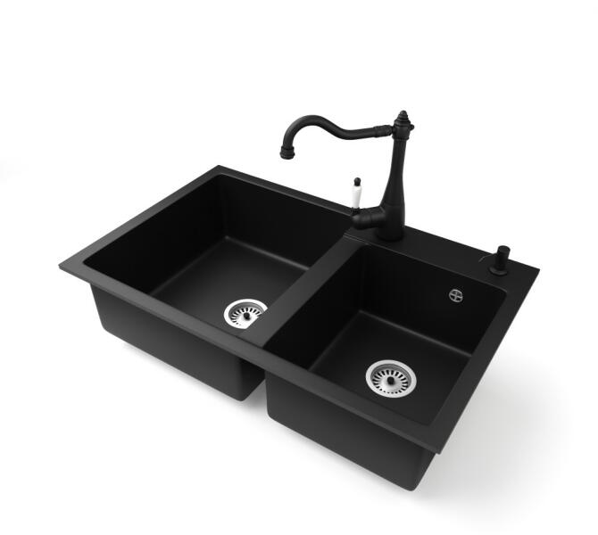 NERO Palazzo gránit mosogatótálca matt fekete színben csapteleppel és adagolóval. A kétmedencés mosogatótálcák 21. századi csúcsmodellje, ami két nagyméretű medencéjével és különleges kialakításával minden konyha tökéletes eleme lehet. Az asszimetrikus kialakításnak köszönhetően a kisebb medence fölött egy praktikus perem helyezkedik el, ahol helyet kapott a csapte