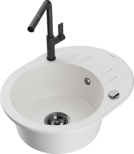 Mexen Elias, gránit mosogató 795x480x200 mm, 1 kamrás és mosogató csaptelep Carla, fehér, 6511-20-670700-70 Elias konyhai mosogató: Fehér szín Méretek: 795x480x200 mm Kamra mélysége: 190 mm Kamra méretei: 465x420 mm Lefolyó átmérője: ø90 mm Típus: 1 kamrás, rövid csepegtetővel Beépítés: felülről a munkalapba süllyesztve Anyaga: gránit (80% gránit adalékanyag 20% gyan