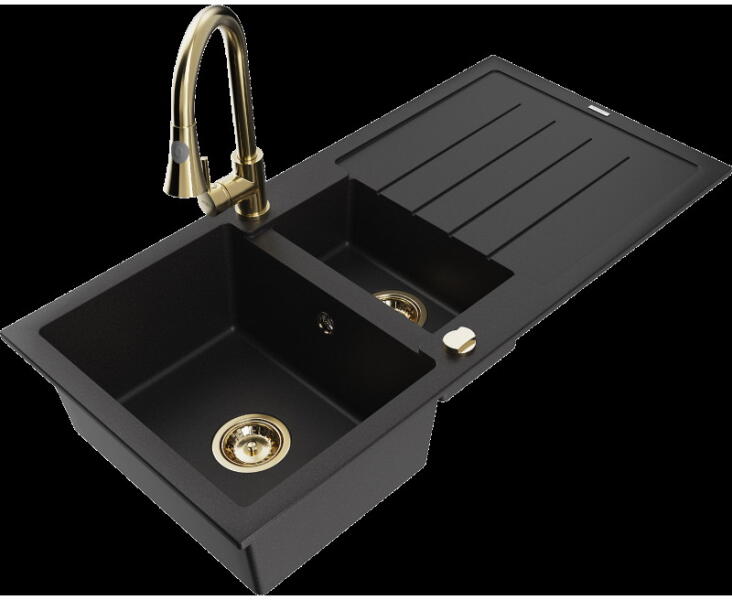 Mexen Mario, 2 kamrás gránit mosogató 82x44 cm konyhai csapteleppel Telma, fekete-arany, 6504-75-670200-70 Mosogató: Termékkód: 6504822000-75 Mérete: 820x436x161 mm Kamra mélysége: 151 mm Kamra méretei: 356x336 mm Lefolyó átmérője: ø90 mm Típus: 2 kamrás Típus: Az asztallapba süllyesztett Szín: fekete-arany Anyaga: gránit (80% gránit adalékanyag 20% gyanta) Túlfolyó nyíl
