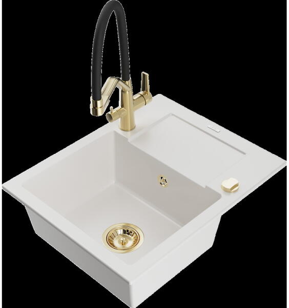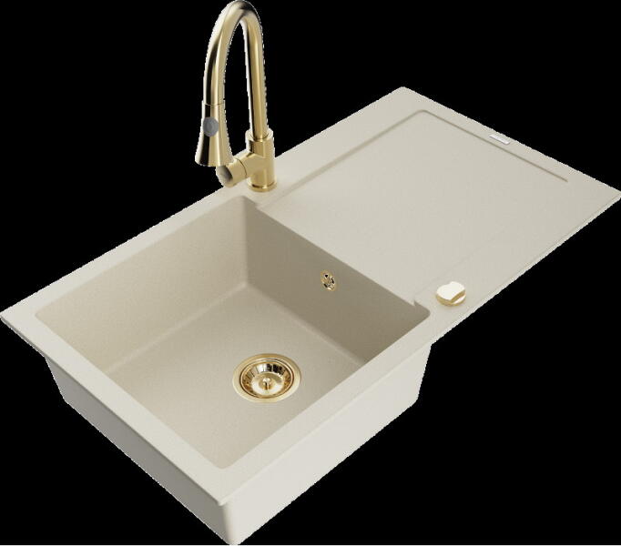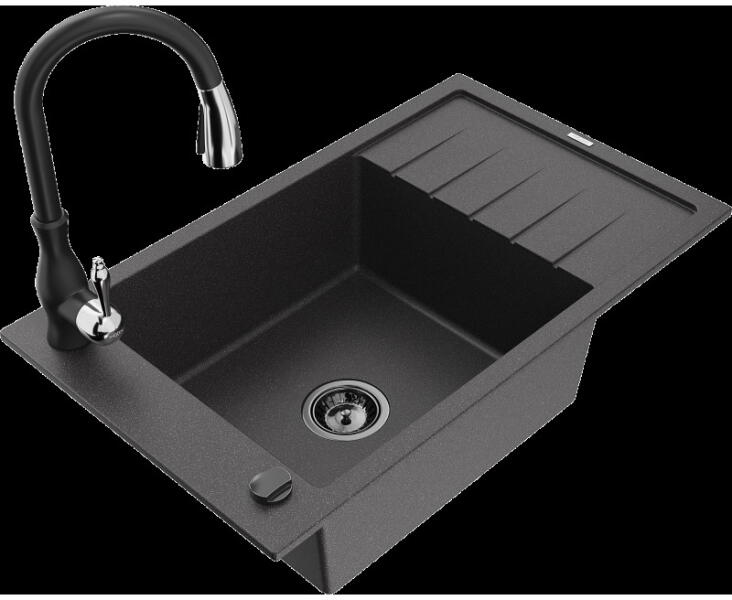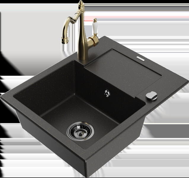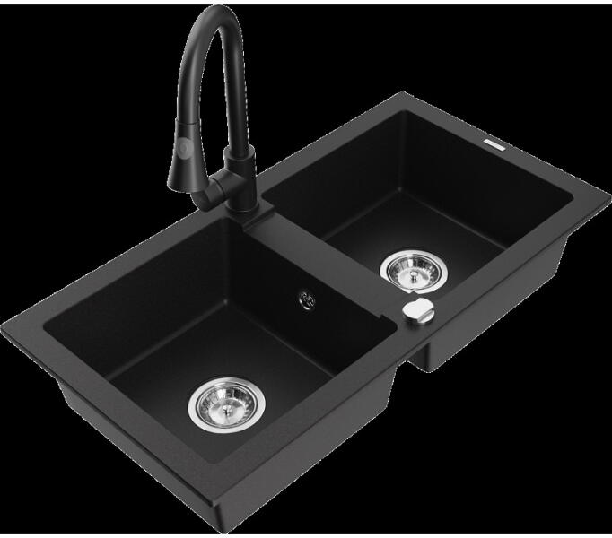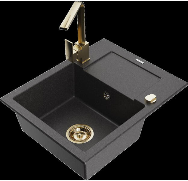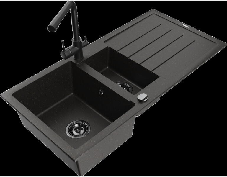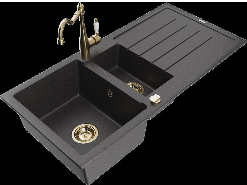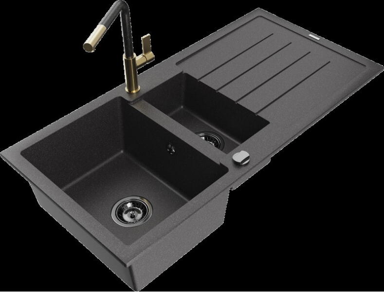 Gyártó: Mexen Sorozat: Bruno + Duo Mosogató: Mérete: 795x495x200 mm Kamra - mélység: 200 mm Kamra méretei: 440x360 mm Kimeneti átmérő: ø90 mm Típus: 1 kamrás csepegtetővel Mosogató típusa: a munkalapba való beágyazáshoz Anyaga: gránit (80% gránit adalékanyag 20% gyanta) Túlfolyó nyílás: Igen Lyukak: 2 (1 lyuk a mosogató csapjához, 1 lyuk az automatikus leeresztő