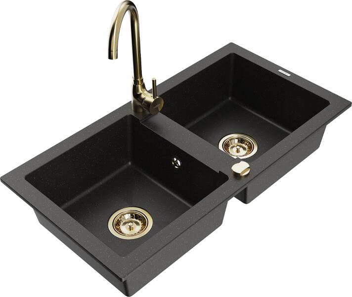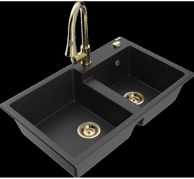 Mexen Mario, 2 kamrás gránit mosogató 82x44 cm konyhai csapteleppel Telma, fekete-arany, 6504-75-670200-50 Mosogató: Termékkód: 6504822000-75 Mérete: 820x436x161 mm Kamra mélysége: 151 mm Kamra méretei: 356x336 mm Lefolyó átmérője: ø90 mm Típus: 2 kamrás Típus: Az asztallapba süllyesztett Szín: fekete-arany Anyaga: gránit (80% gránit adalékanyag 20% gyanta) Túlfolyó nyíl