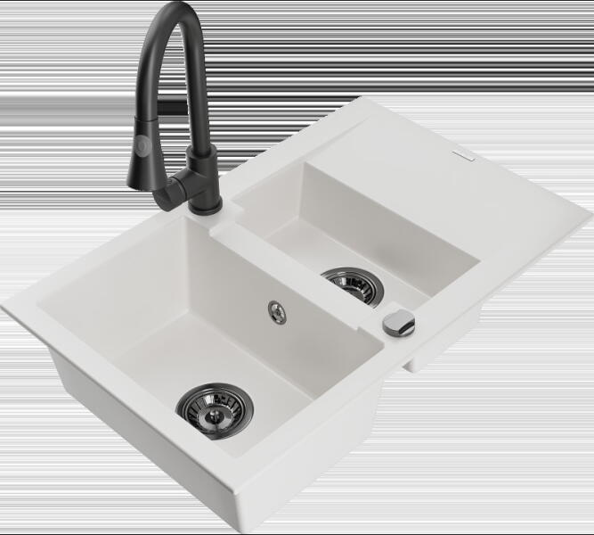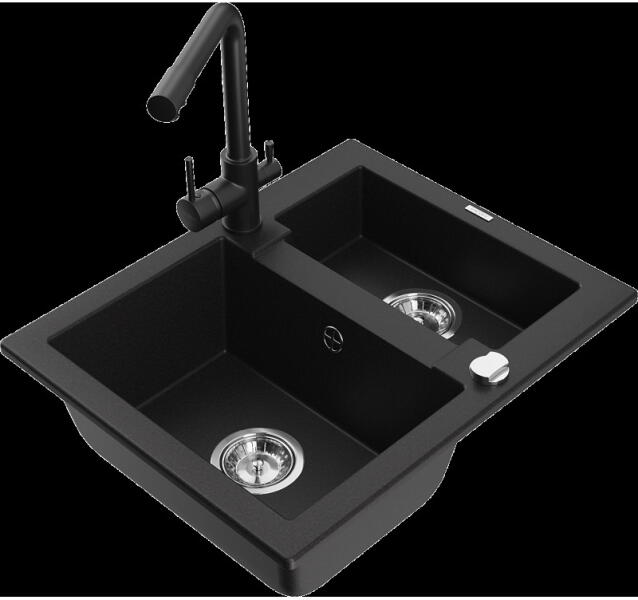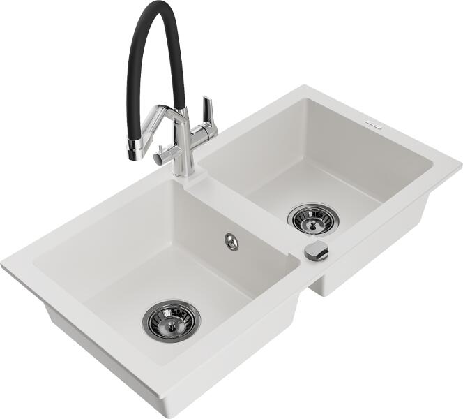 Mexen Mario konyhai mosogató: Méretek: 820x436x161 mm Kamra mélysége: 151 mm Kamra méretei: 356x336 mm Lefolyó átmérője: ø90 mm Típus: 2 kamrás Típus: felülről az asztal munkalapjába süllyesztve Anyaga: gránit (80% gránit adalékanyag 20% gyanta) Túlfolyó lyuk: igen Lyukak: 2 (1 x mosogató csaptelep, 1 x automatikus leeresztő csavar vezérlés) Nagy ellenállás a karc