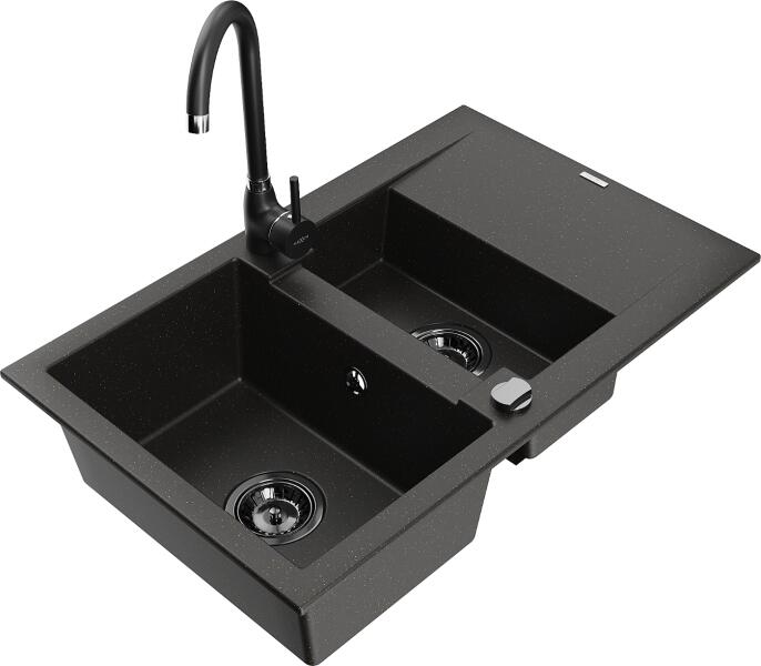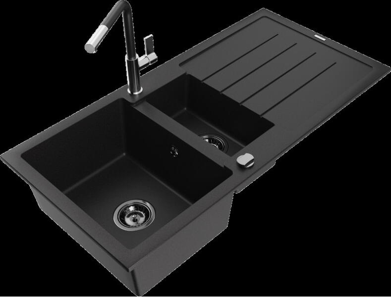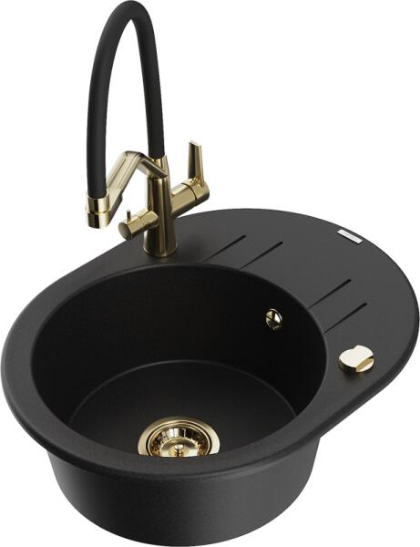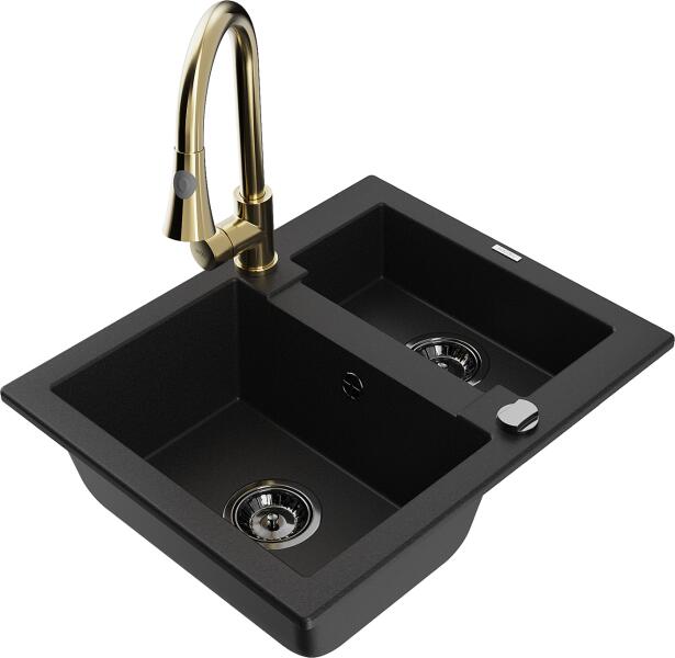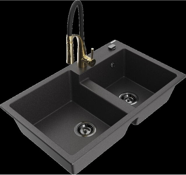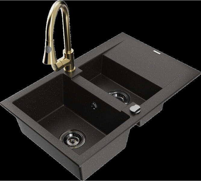 Mexen Gaspar, gránit mosogató 737x475x177 mm, 1,5 kamrás és fekete Telma csaptelep, fekete-arany metál, 6507-75-670200-70-B Gyártó: Mexen Sorozat: Gáspár Modell: 1,5-kamrás, rövid leeresztővel Felszerelés: munkalapra Szín: fekete - arany metál Hossza 737 mm Szélesség 475 mm Magasság: 177 mm Kamra mélysége: 167 mm (nagyobb), 107 mm (kisebb) Kamra mérete: 395x272 mm (nagyobb), 3