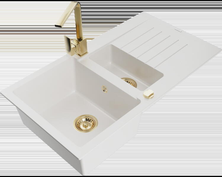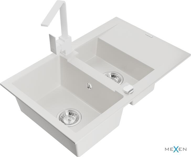 Mexen Gaspar, gránit mosogató 737x475x177 mm, 1,5 kamrás és Rita króm csaptelep, fehér, 6507-20-670300-20 Gyártó: Mexen Sorozat: Gáspár Modell: 1,5-kamrás, rövid leeresztővel Felszerelés: munkalapra Fehér szín Hossza 737 mm Szélesség 475 mm Magasság: 177 mm Kamra mélysége: 167 mm (nagyobb), 107 mm (kisebb) Kamra mérete: 395x272 mm (nagyobb), 375x182 mm (kisebb) Lefolyó átm