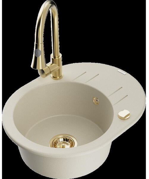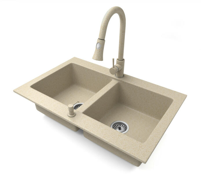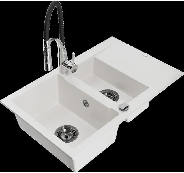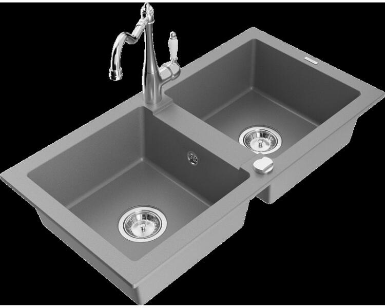 NERO Verso gránit mosogatótálca bézs színben csapteleppel és mosogatószer adagolóval. Kétmedencés, szimmetrikus elrendezésű mosogató, kellően nagyméretű medencékkel, a 75 cm-es szélesség egyszerre tágas és helytakarékos is. Letisztult formatervezés, kiemelkedő anyagvastagság jellemzi, ezáltal rendkívül masszív és ellenálló konstrukció. Anyaga 80% gránit őrlemény