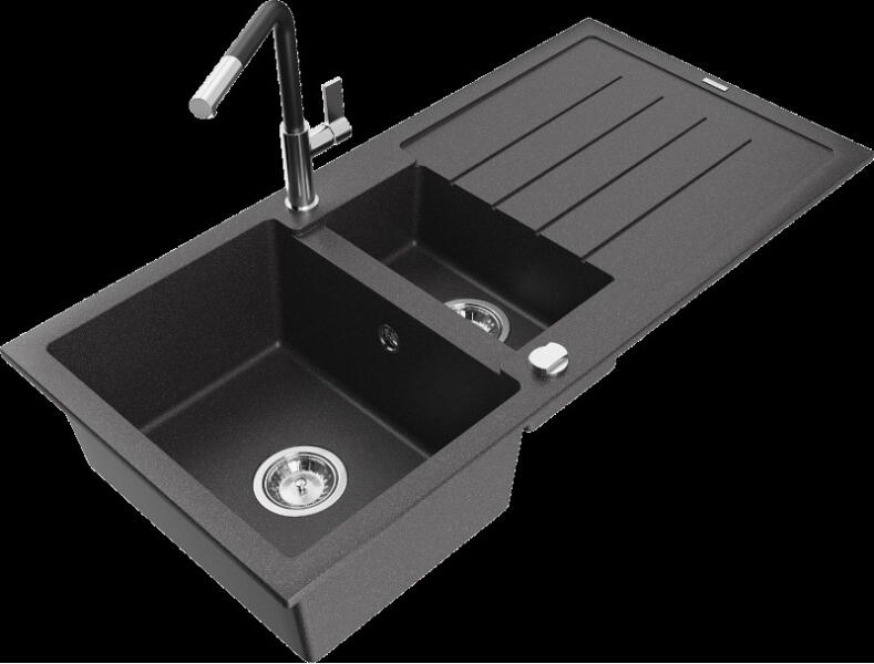 NERO Arriva gránit mosogató, ami több szempontból is nagyszerű választás. Mindössze 60 cm helyet foglal, de tágas medencéjének, és a gyümölcsmosónak és kis perem részének köszönhetően nagyon praktikus. Használhatóságát tovább erősíti az 50 cm-es mérete a fal felé, valamint a fő medence közel 20 cm-es mélysége. A mosogatón 2 lyuk található egymással szemben, ez