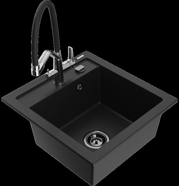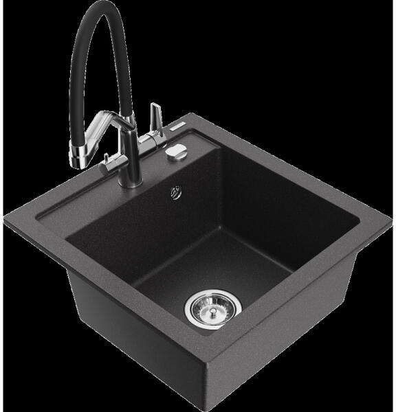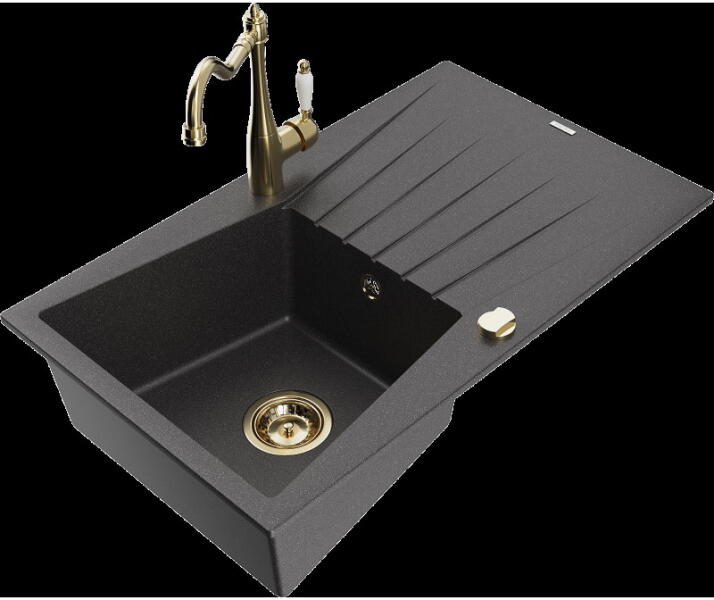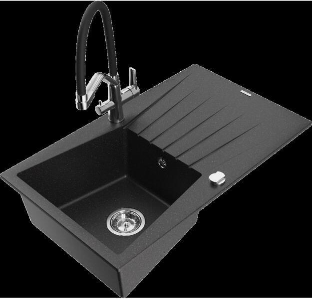 Nero Grande gránit mosogató, ami egyszerre modern és látványos, valamint tökéletesen kihasználható nagyobb edények tisztítására is. A nagyméretű 46.5 x 42 cm-es (emellett 20 cm mély) medence mellett egy csepegtető rész is kialakításra került, mindez úgy, hogy nem vesz el jelentős helyet a konyhai munkafelületből. Modern megjelenésű, letisztult szögletes formavilág jell