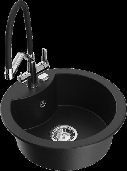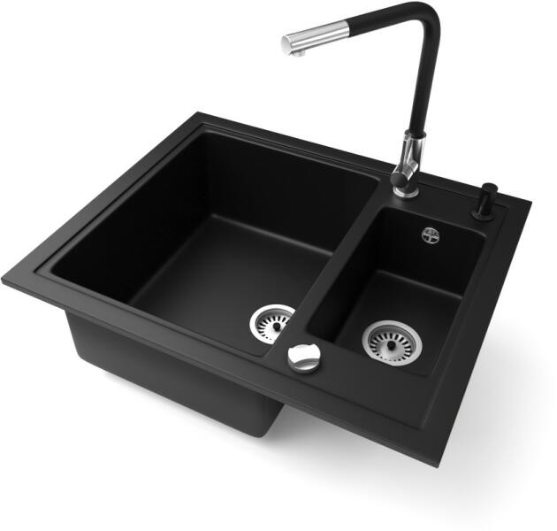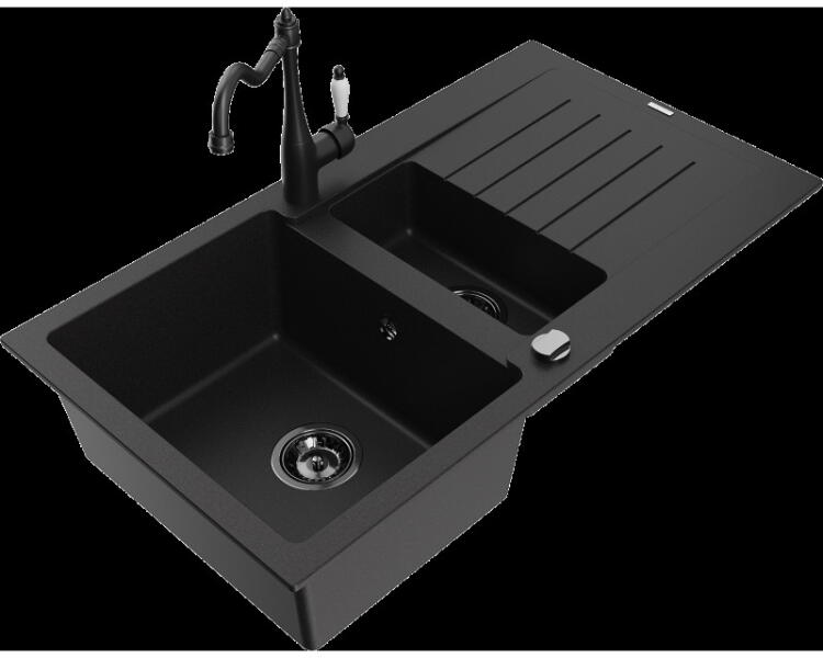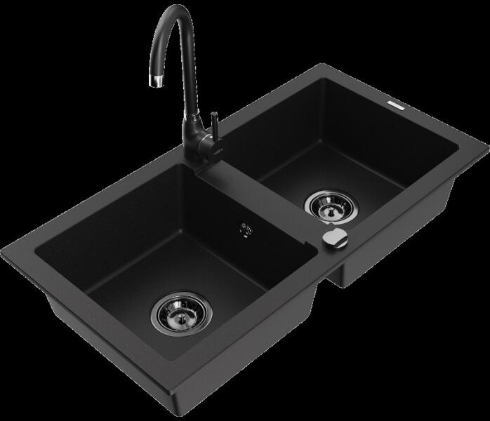 Evinion gránit mosogató szett fekete színben, extra nagy medencével. A medence mérete 48.5 x 38.5 cm, amiben szinte bármilyen méretű edény elfér. Modern megjelenésű, letisztult szögletes formavilág jellemzi, kiváló eleme lehet egy minimál vagy modern stílusú konyhának. A csapnak kialakított lyuk oldalt helyezkedik el, ami mellett kényelmesen elhelyeztehő egy mosogatószer ad