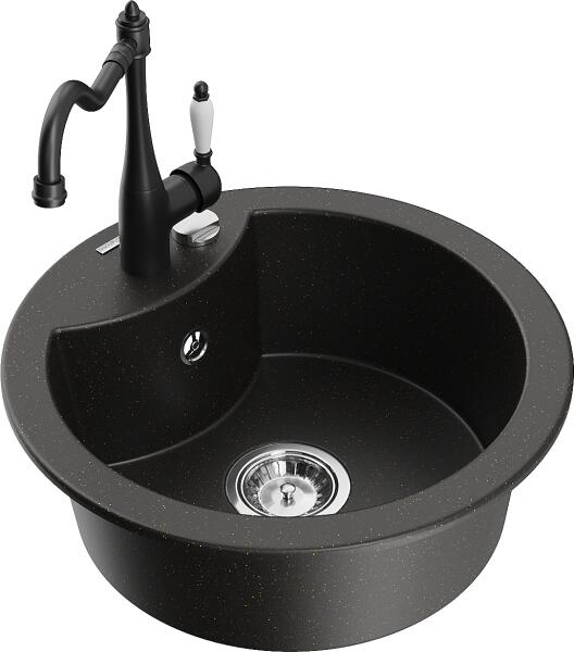 Mexen Diego, gránit mosogató 488x488x167 mm, 1 kamrás és Carla mosogató csaptelep, fekete-arany metál, 6512-75-670700-70 Gyártó: Mexen Sorozat: Diego Modell: 1 kamrás Beépítés: felülről a munkalapba való beágyazáshoz Szín: fekete/arany metál Felület típusa : sima Hossza 488 mm Szélesség 488 mm Magasság: 167 mm Kamra mélysége: 157 mm Kamra mérete: 406 mm Lefolyó átmér