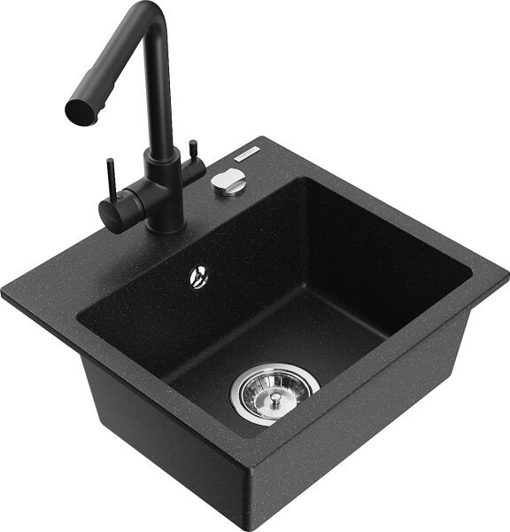 Mexen Milo, gránit mosogató 435x410x171 mm, 1 kamrás és fekete Duero csaptelep, fekete, 6505-77-671600-70 A konyhai mosogató műszaki adatai: Gyártó: Mexen Sorozat: Milo Modell: 1 kamrás Felszerelés: munkalapra Fekete szín Hossza 435 mm Szélesség 410 mm Magasság: 171 mm Kamra mélysége: 161 mm Kamra mérete: 375x280 mm Lefolyó átmérője: Ø 90 mm Szifon + automatikus leeresztő A