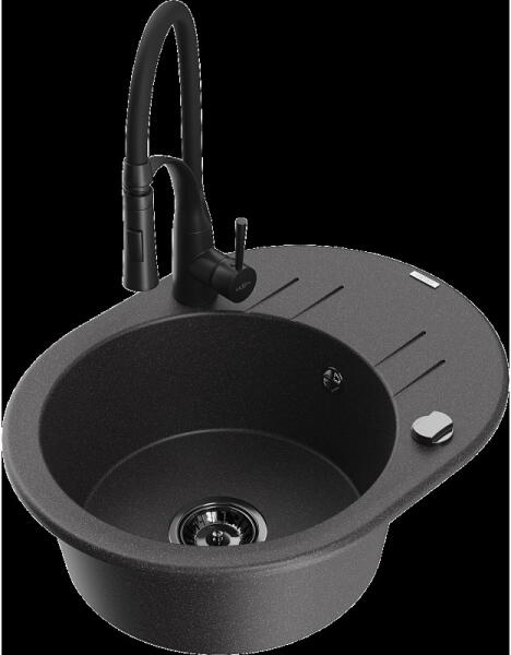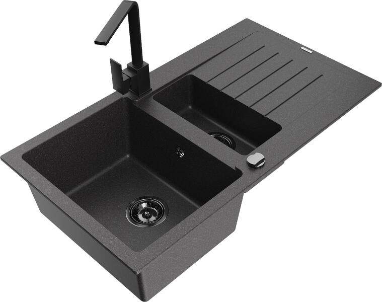 Mexen Matias, gránit mosogató 900x505x200 mm, 1,5 kamrás és fekete csaptelep Rita, fekete foltos, 6502-76-670300-70-B Gyártó: Mexen Sorozat: Matias Modell: 1,5-kamrás lefolyóval Beépítés: a munkalapba való beágyazáshoz Szín: fekete foltos Felületkezelés: sima Hossza 900 mm Szélesség 505 mm Magasság: 200 mm Kamra mélysége: 180 mm (nagyobb), 115 mm (kisebb) Kamra mérete: 435x