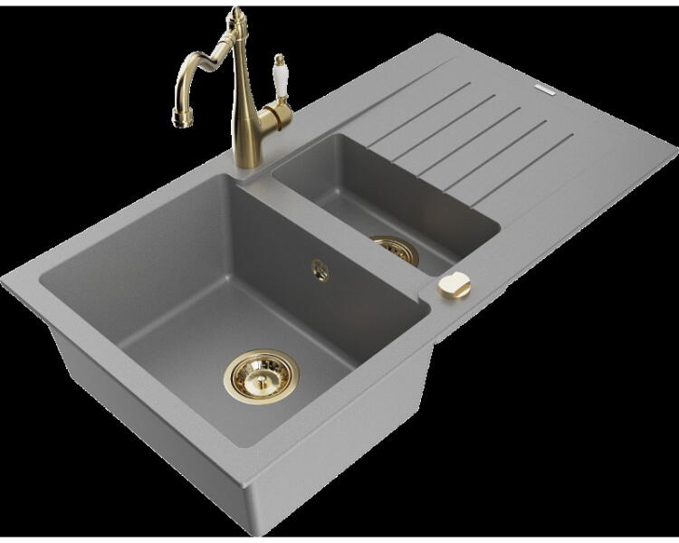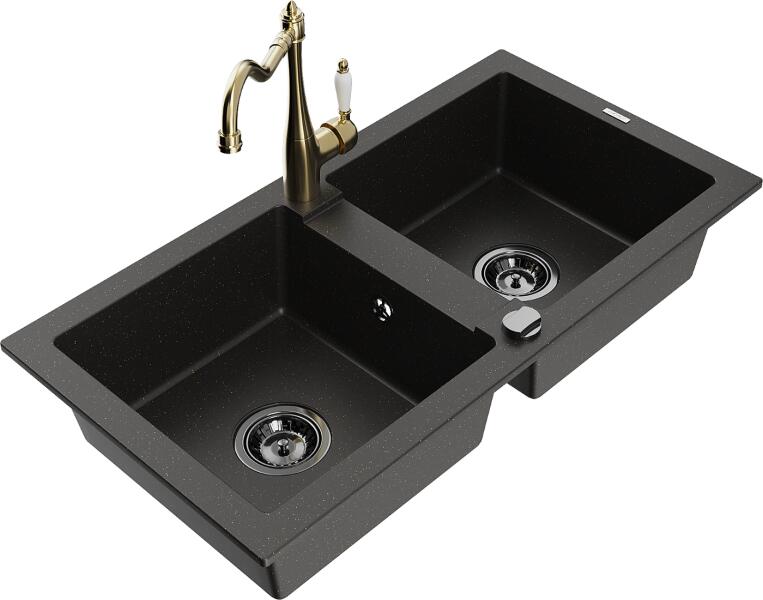 Mexen Mario, gránit mosogató 820x436x161 mm, 2 kamrás és mosogató csaptelep Carla, fekete-arany metál, 6504-75-670700-50-B Gyártó: Mexen Sorozat: Mario + Carlo Mosogató: Méretek: 820x436x161 mm Kamra mélysége: 151 mm Kamra méretei: 356x336 mm Lefolyó átmérője: ø90 mm Típus: 2 kamrás Típus: felülről az asztal munkalapjába süllyesztve Anyaga: gránit (80% gránit adalékanya