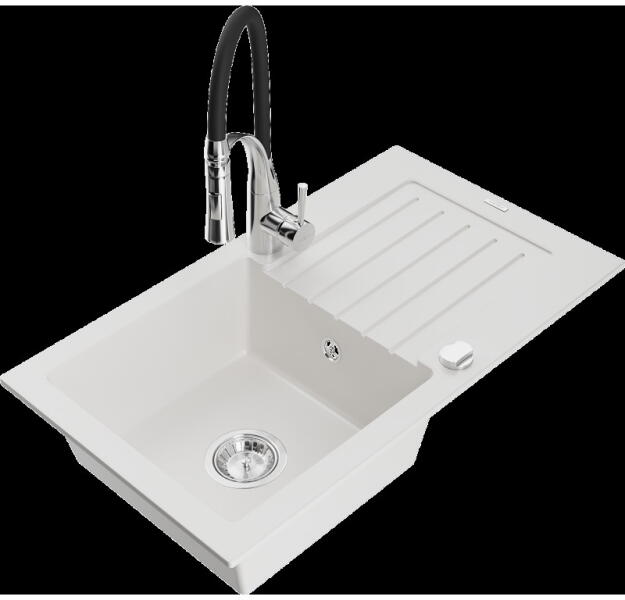 Mexen Elias konyhai mosogató: Gyártó: Mexen Sorozat: Elias Modell: 1 kamrás Beépítés: felülről a munkalapba süllyesztve Méretek: 795x480x200 mm Kamra mélysége: 190 mm Kamra mérete: 465x420 mm Lefolyó átmérője: 90 mm Szifon + automatikus leeresztő csavar Anyaga: gránit (80% gránit - kő, 20% gyanta) Sima felület a könnyű tisztítás érdekében: igen Megnövelt ellenállás