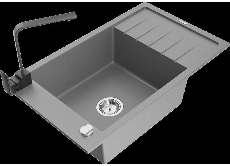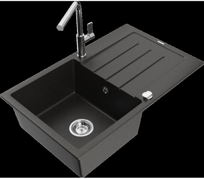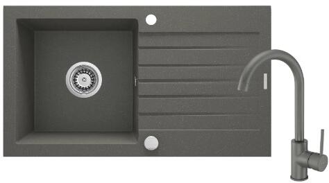 1 medencés, gránit mosogató csepegtetővel, csapteleppel|Kivitelezés: antracit metál|Beszerelési mód: süllyesztett|Minimális szekrényszélesség: 500 mm|Hosszúság: 760 mm|Szélesség: 440 mm|Magasság: 160 mm|Mosogatógép-csatlakozással ellátott szerelvényekkel felszerelt mosogató|Automatikus lefolyóelzárással ellátott szifonok|Antracit metál színű csaptelep|Csaptelep típu