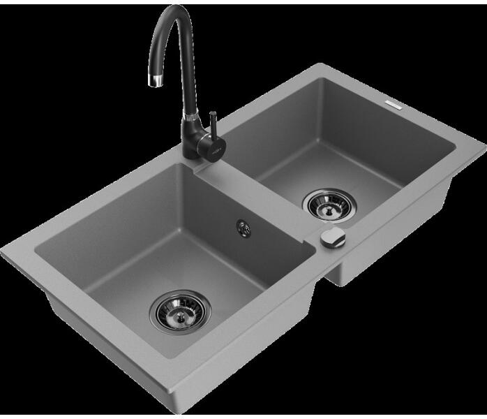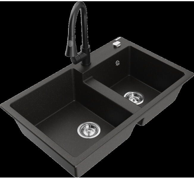 Mexen Tomas, gránit mosogató 800x500x190 mm, 2 kamrás és fekete Telma csaptelep, fekete, 6516-77-670200-70 A konyhai mosogató műszaki adatai: Gyártó: Mexen Sorozat: Tomas Modell: 2-kamrás csepptálca nélkül Felszerelés: munkalapra Fekete szín Felületkezelés: sima Hossza 800 mm Szélesség 500 mm Magasság: 190 mm Kamra mélysége: 180 mm (nagyobb), 180 mm (kisebb) Kamra mérete: 44