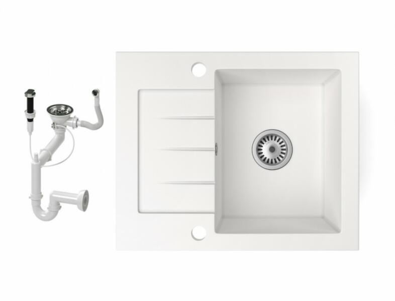 NERO Monza gránit mosogatótálca fehér színben. Kis méretének köszönhetően tökéletesen illik olyan kisebb méretű konyhákba ahol minden centiméter helyre szükség van. Mindössze 57 cm széles, amelyet mélységével kompenzál, így mind a medence, mind a csepegtető rész tökéletesen használható. Modern, karakteresen szögletes formavilág és kiemelkedő anyagvastagság jelle