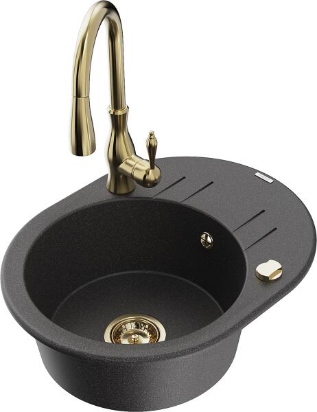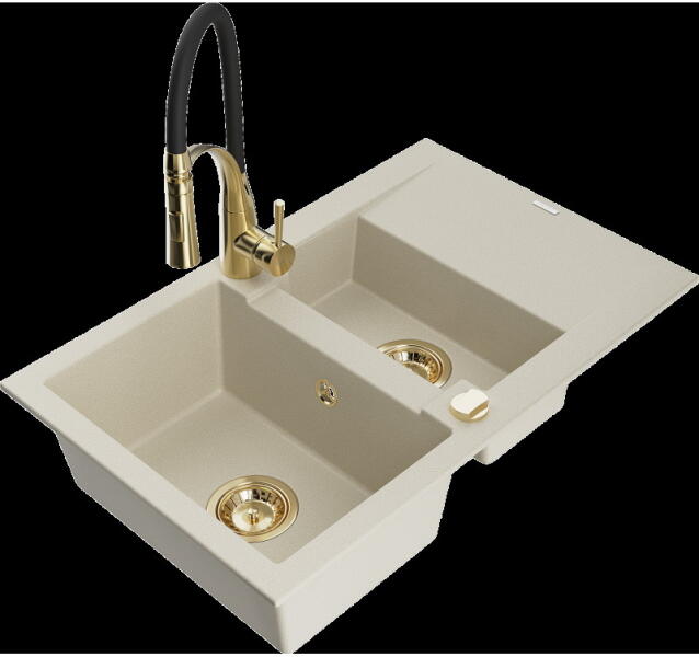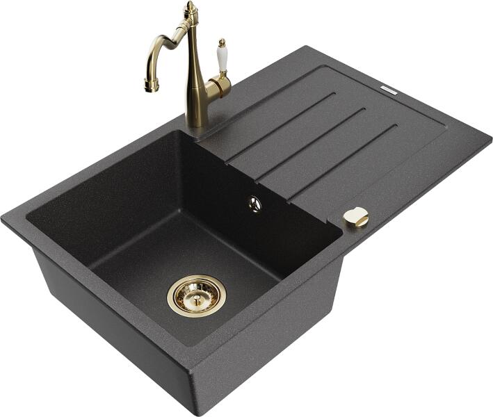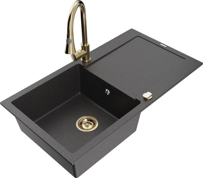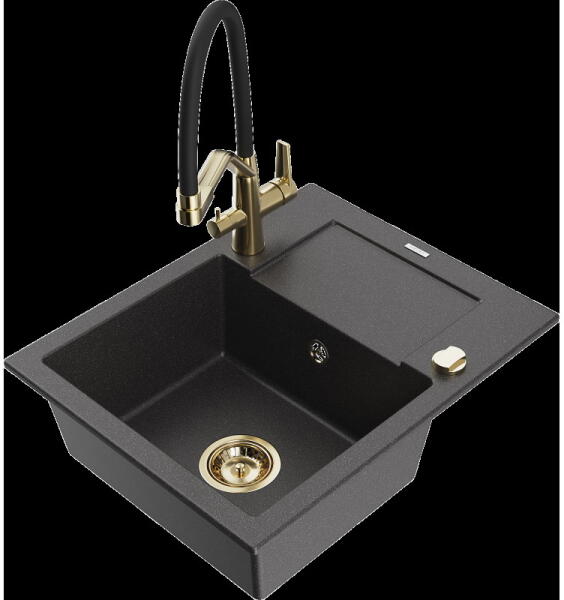 Mexen Enzo, gránit mosogató 576x465x174 mm, 1 kamrás, Duero arany csaptelep, szürke, 6506-71-671600-50 Gyártó: Mexen Sorozat: Enzo Modell: 1 kamrás, rövid csepegtetővel Hossza 576 mm Szélesség 465 mm Magasság: 174 mm Szín: szürke Kamra mélysége: 164 mm Kamra mérete: 395x320 mm Szifon + automatikus leeresztő csavar Anyaga: gránit (80% gránit - kő, 20% gyanta) Megnövelt ellená