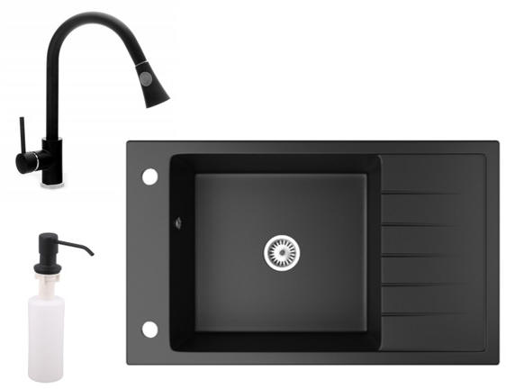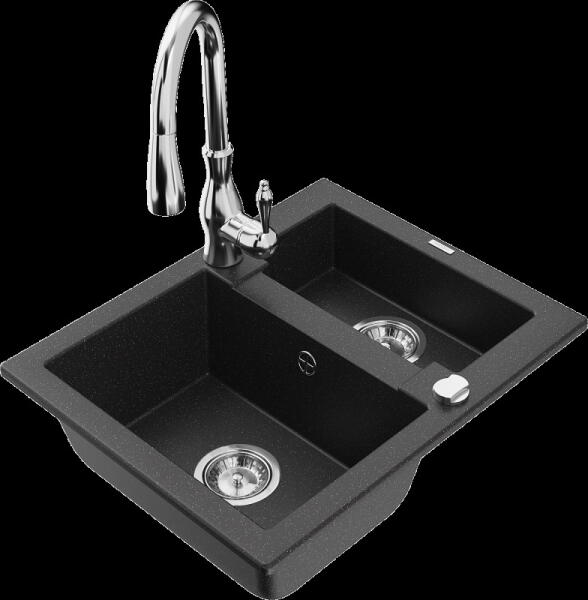 Mexen Kevin, gránit mosogató 586x458x190 mm, 1 kamrás és Savita mosogató csaptelep, fekete foltos, 6517-76-672601-50 Gyártó: Mexen Sorozat: Kevin Szín: fekete foltos Modell: 1 kamrás, rövid leeresztővel Beépítés: a munkalapba való beágyazáshoz Méretek: 586 x 458 x 190 mm Kamra mérete: 378 x 374 mm Kamra mélysége: 175 mm A lefolyó átmérője: Ø 90 mm Szifon + automatikus lee