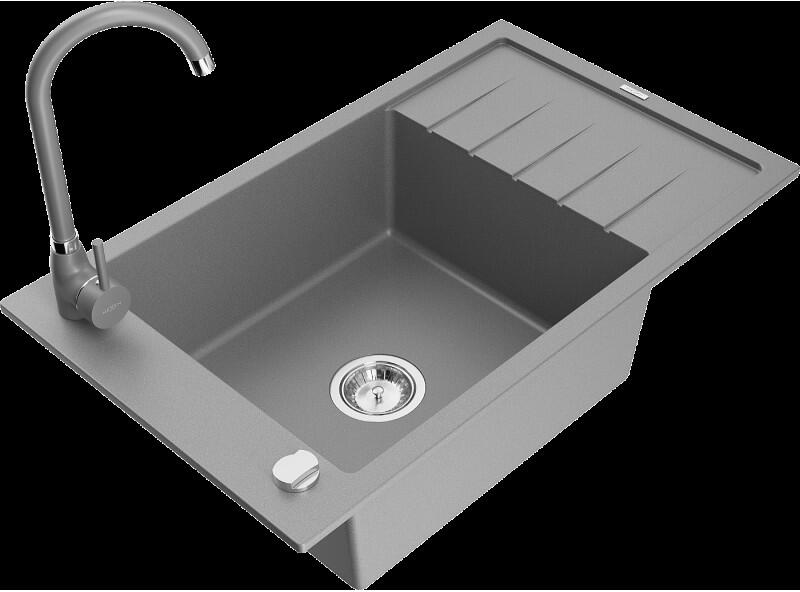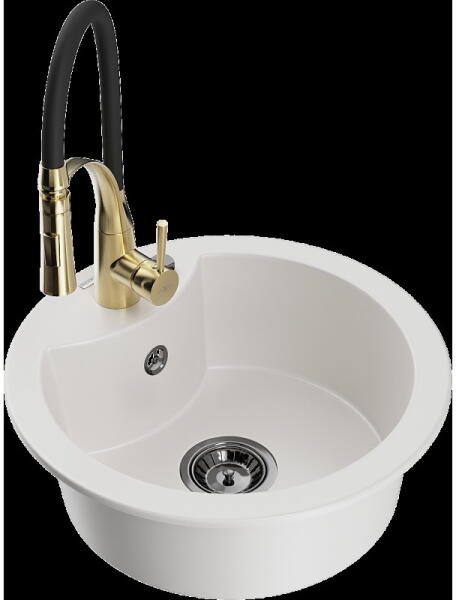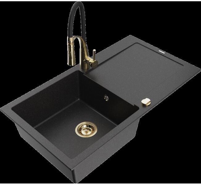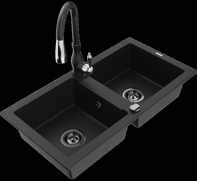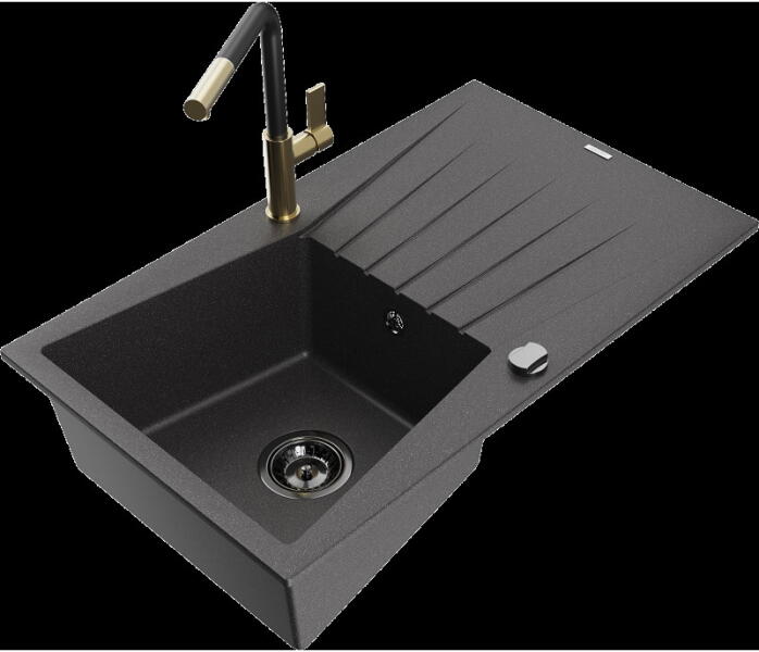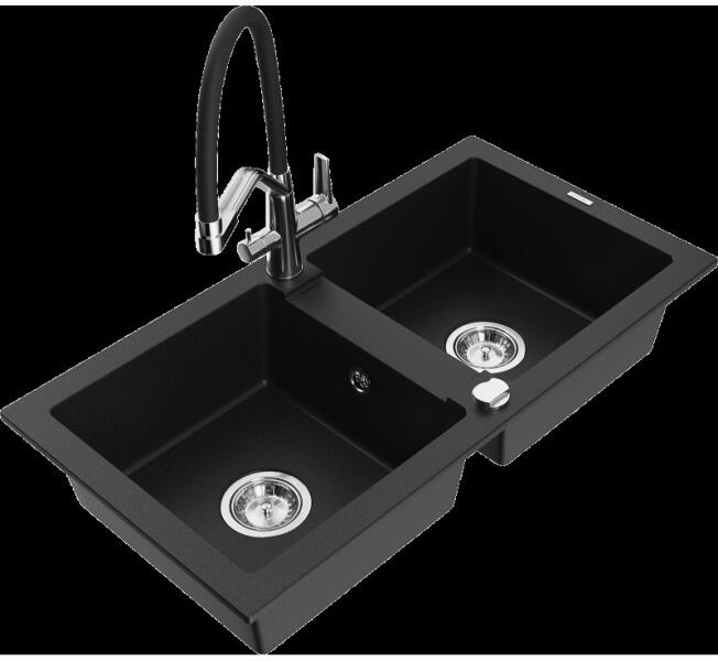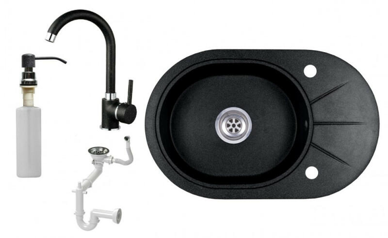 Laneo ZIA gránit mosogató szett fekete színben. Teljes készlet, ami tartalmazza a magasított csaptelepet, a beépített mosogatószer adagolót és a szifon készletet. Ovális kialakítású, egyedi megjelenésű mosogató, méretes, 44,5 x 37 cm-es medencével, ami 19 cm mély. Egyszerre stílusos és kiválóan alkalmas nagyobb edények mosogatására is. CSOMAG TARTALMA: - Gránit mosogat