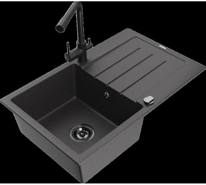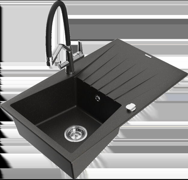 NERO Eris gránit mosogatótálca szemcsés fekete színben, ami 78 x 50 cm-es méretével, valamint a 20 cm mély medencével minden igényt kielégít, mégsem foglal sok helyet a konyhai munkafelületből. Markánsan bordázott, de letisztult csepegtető rész és körben vízvető perem kapott helyet. A mosogatón 2 lyuk található, egy a csaptelepnek és egy a mosogatószer adagolónak vagy