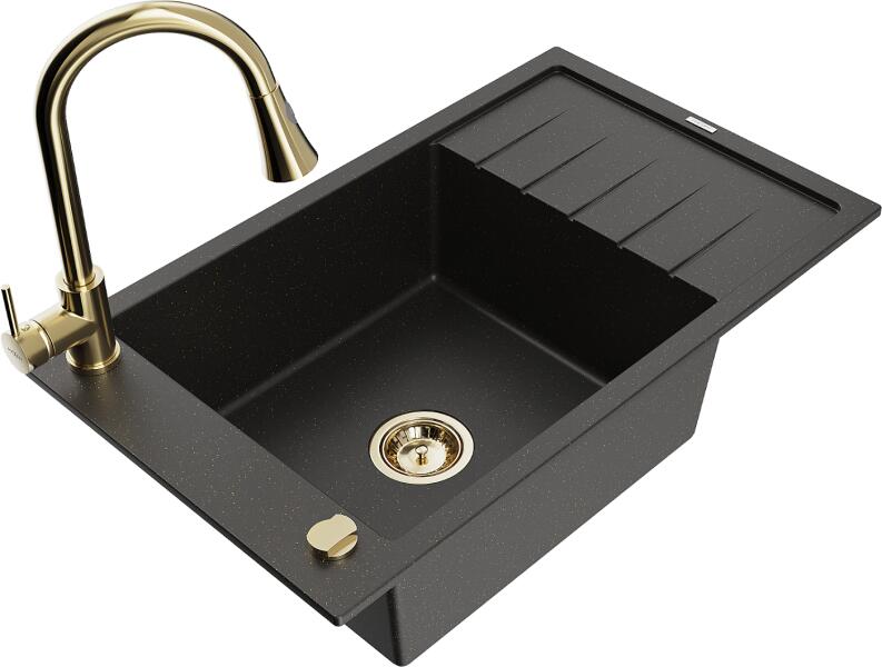 Mexen Cesar, gránit mosogató 775x470x190 mm, 1 kamrás, fekete foltos arany szifonnal és arany Rita mosogató csaptelep, 6514-76-670300-50 A konyhai mosogató műszaki adatai: Gyártó: Mexen Sorozat: Cesar Modell: 1 kamrás Felszerelés: munkalapra Szín: fekete foltos Felület: sima Hossza 775 mm Szélesség 470 mm Magasság: 190 mm Kamra mélysége: 180 mm Kamra mérete: 410x355 mm Lefolyó
