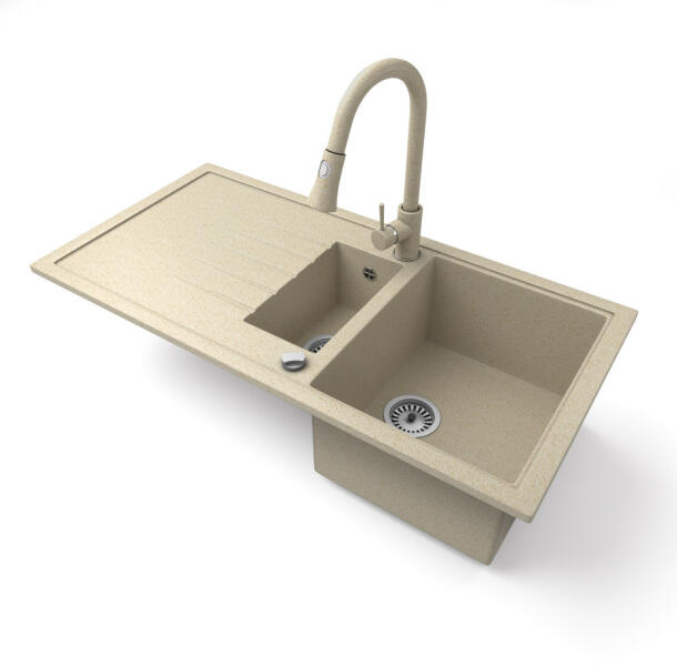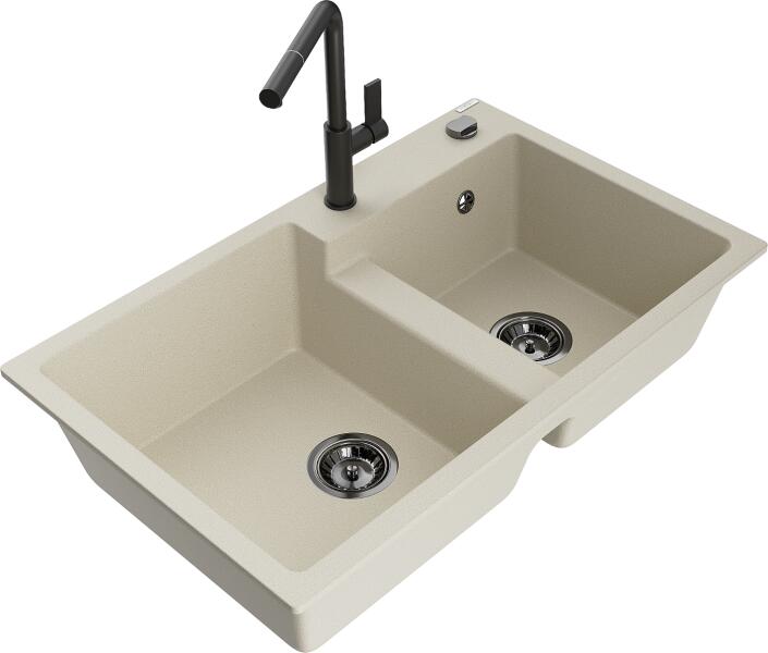 Mario konyhai mosogató: Méretek: 820x436x161 mm Kamra mélysége: 151 mm Kamra méretei: 356x336 mm Lefolyó átmérője: ø90 mm Típus: 2 kamrás Típus: felülről a munkalapba süllyesztve Anyaga: gránit (80% gránit adalékanyag 20% gyanta) Túlfolyó lyuk: igen Lyukak: 2 (1 x mosogató csaptelep, 1 x automatikus leeresztő csavar vezérlés) Nagy ellenállás a karcolásokkal és el