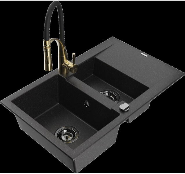 Mexen Andres, gránit mosogató 1000x500x200 mm, 1,5 kamrás, fekete-arany metál króm szifonnal és Telma króm mosogató csaptelep, 6515-75-670200-00 Gyártó: Mexen Sorozat: Andres Modell: 1,5-kamrás lefolyóval Felszerelés: munkalapra Szín: fekete - arany metál Felületkezelés : sima Hossza 1000 mm Szélesség 500 mm Magasság: 200 mm Kamra mélysége: 190 mm (nagyobb), 115 mm (kisebb) K
