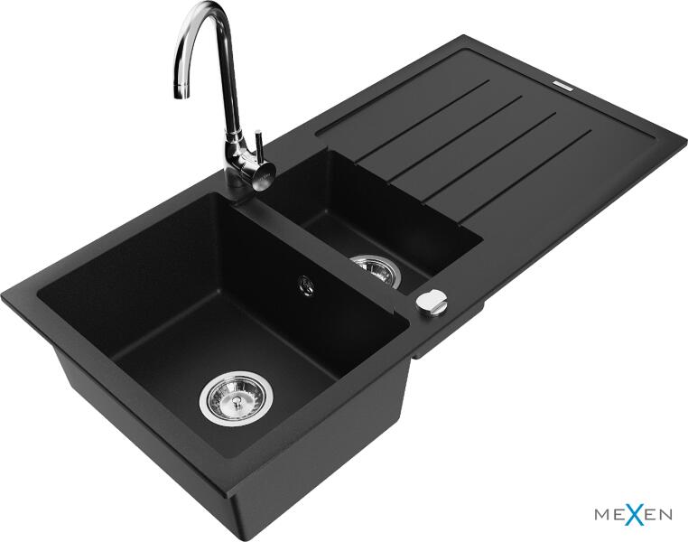 Mexen Gaspar konyhai mosogató Gyártó: Mexen Sorozat: Gáspár Modell: 1,5-kamrás, rövid leeresztővel Beépítés: felülről a munkalapba való beágyazáshoz Hossza 737 mm Szélesség 475 mm Magasság: 177 mm Kamra mélysége: 167 mm (nagyobb), 107 mm (kisebb) Kamra mérete: 395x272 mm (nagyobb), 375x182 mm (kisebb) Lefolyó átmérője: 90 mm Szifon + automatikus leeresztő csavar Anyaga: