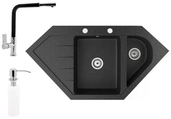 NERO Joker sarok mosogató, ami egyben praktikus és impozáns látványelem is a konyhában. Tökéletes választás azokba a konyhákba, ahol a mosogató rész a sarokban lett kialakítva. Szögletes, határozott vonalvezetése nagyszerűen illik modern vagy minimál stílusú konyhákba. A mosogatón 2 lyuk lett kialakítva, egy a csaptelepnek és egy a beépíthető mosogatószer adagolónak v
