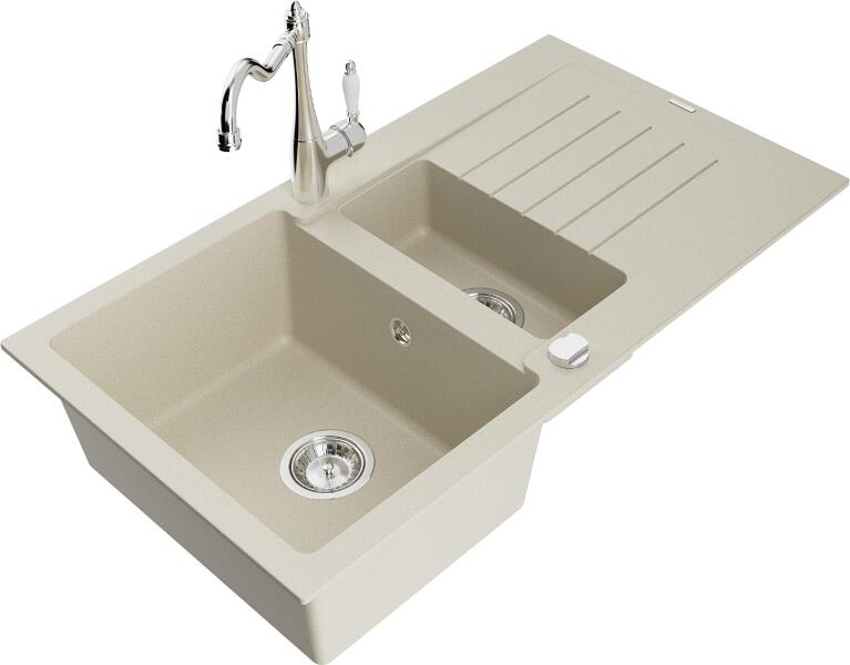 Mexen Matias, gránit mosogató 900x505x200 mm, 1,5 kamrás és mosogató csaptelep Carla, bézs, 6502-69-670700-00 Gyártó: Mexen Sorozat: Matias + Carlo Mosogató: Modell: 1,5-kamrás lefolyóval Beépítés: felülről a munkalapba való beágyazáshoz Felület: sima Hossza 900 mm Szélesség 505 mm Magasság: 200 mm Kamra mélysége: 180 mm (nagyobb), 115 mm (kisebb) Kamra mérete: 435x335 mm