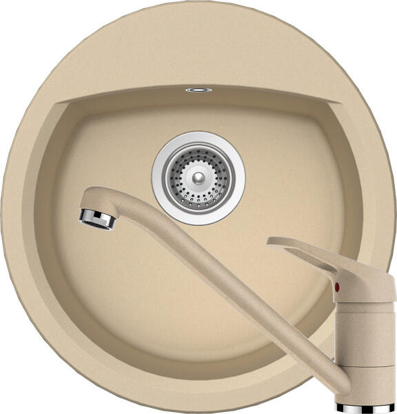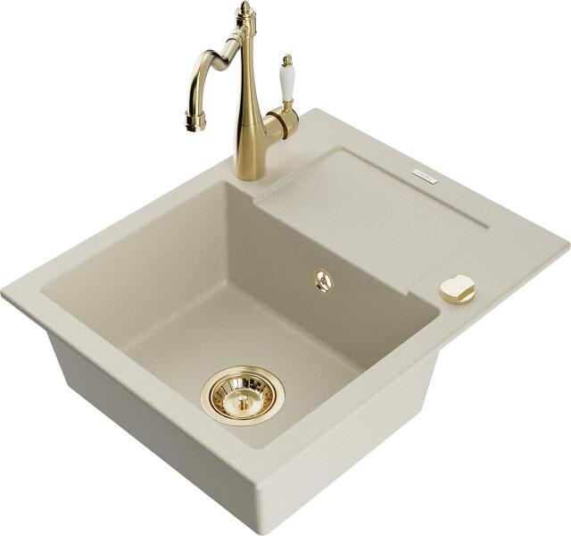 Mexen Enzo, gránit mosogató 576x465x174 mm, 1 kamrás és mosogató csaptelep Carla, bézs, 6506-69-670700-50 Gyártó: Mexen Sorozat: Enzo Modell: 1 kamrás, rövid csepegtetővel Beépítés: felülről a munkalapba süllyesztve Hossza 576 mm Szélesség 465 mm Magasság: 174 mm Szín: bézs Kamra mélysége: 164 mm Kamra mérete: 395x320 mm Szifon + automatikus leeresztő csavar Anyaga: grán