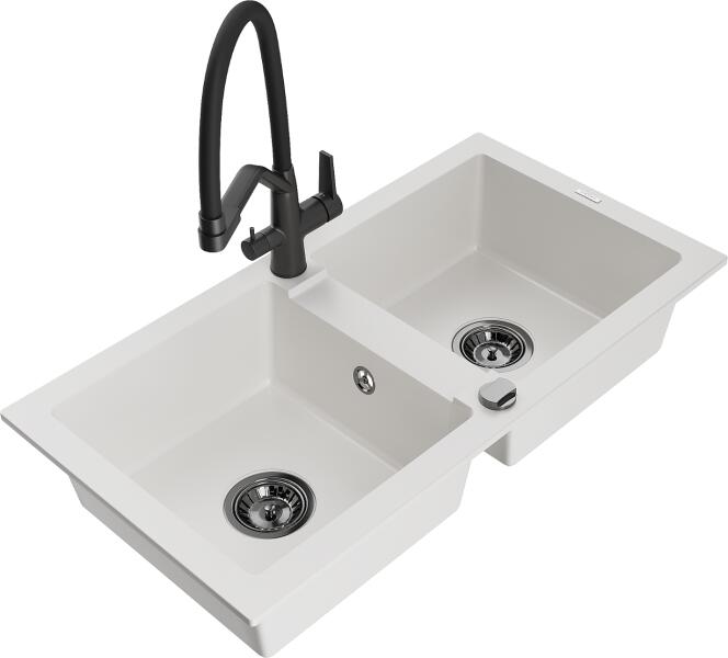 Mexen Mario konyhai mosogató: Méretek: 820x436x161 mm Kamra mélysége: 151 mm Kamra méretei: 356x336 mm Lefolyó átmérője: ø90 mm Típus: 2 kamrás Típus: felülről az asztal munkalapjába süllyesztve Anyaga: gránit (80% gránit adalékanyag 20% gyanta) Túlfolyó lyuk: igen Lyukak: 2 (1 x mosogató csaptelep, 1 x automatikus leeresztő csavar vezérlés) Nagy ellenállás a karc