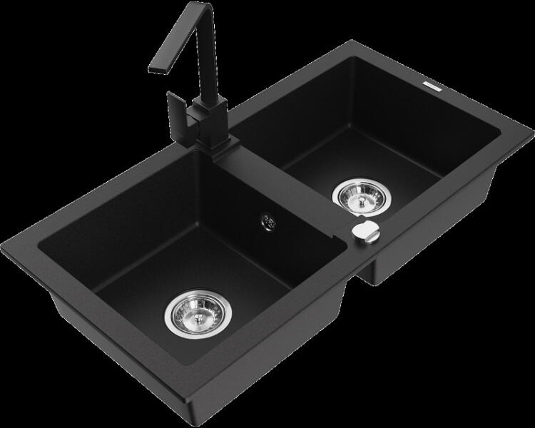 Mexen Mario, gránit mosogató 820x436x161 mm, 2 kamrás, fekete króm szifonnal és fekete Rita mosogató csaptelep, 6504-77-670300-70 Gyártó: Mexen Sorozat: Mario Modell: 2 kamrás Fekete szín Felületkezelés: sima Felszerelés: munkalapra Hossza 820 mm Szélesség 436 mm Magasság: 161 mm Kamra mélysége: 151 mm Kamra mérete: 356x336 mm Lefolyó átmérője: 90 mm Szifon + automatikus lee
