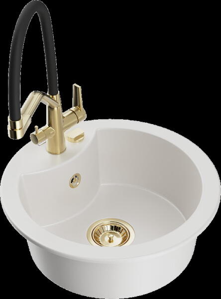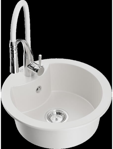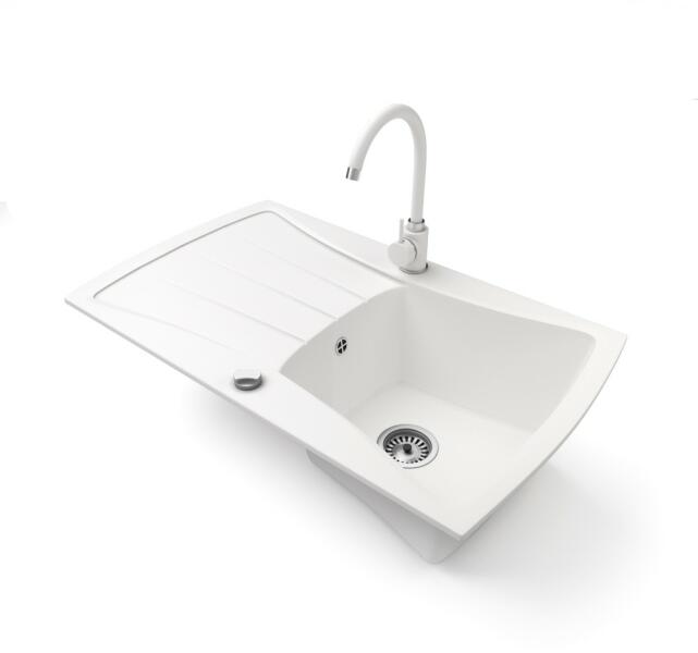 NERO Venezia gránit mosogató fehér színben. Egyedi és különleges formával tervezett egymedencés mosogató, kellően nagyméretű csepegtető résszel. A velencei gondolákat idéző, harmonikusan kialakított ívekkel a konyha esztétikus része, emellett anyagvastagságának köszönhetően rendkívül masszív konsktrukció. A mosogatón 2 lyuk található, egy a csaptelepnek és egy a