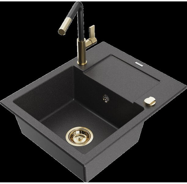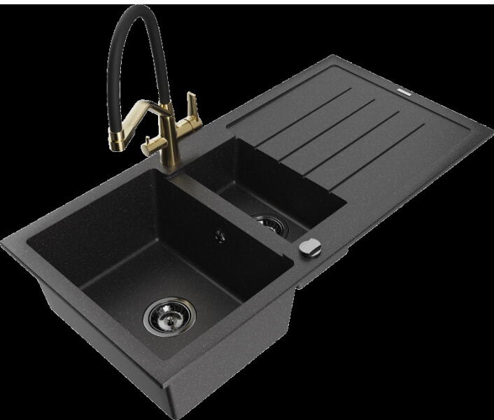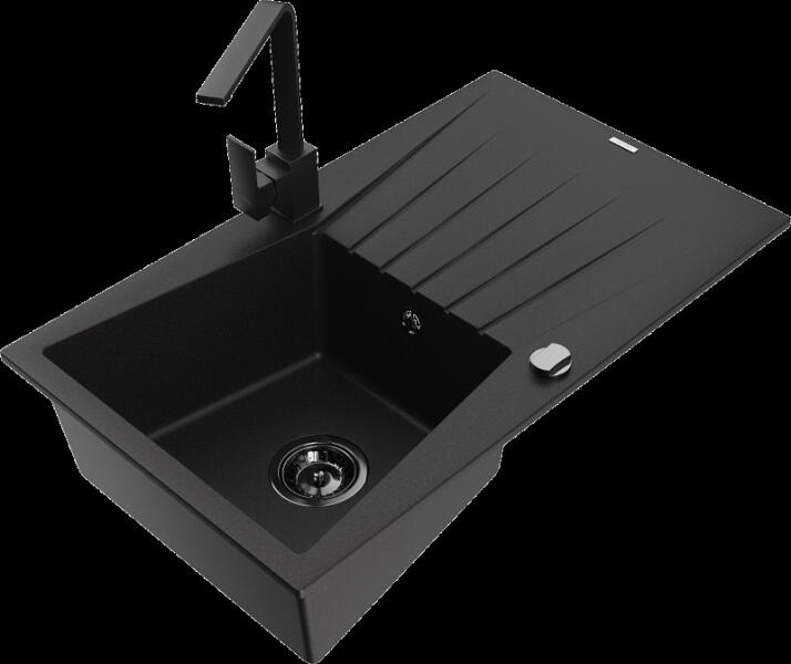 Mexen Leo, gránit mosogató 900x500x190 mm, 1 kamrás és Aster mosogató csaptelep, fekete, 6501-77-73450-57-B Gyártó: Mexen Sorozat: Leo Modell: 1-kamrás s csepegtetővel Fekete szín Felület: sima Beépítés: felülről a munkalapba süllyesztve Hossza 900 mm Szélesség 500 mm Magasság: 190 mm Kamra mélysége: 180 mm Kamra mérete: 430x415 mm 500 mm-es méretű szekrényekhez Szifon +