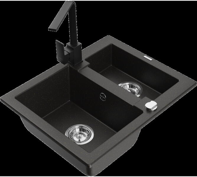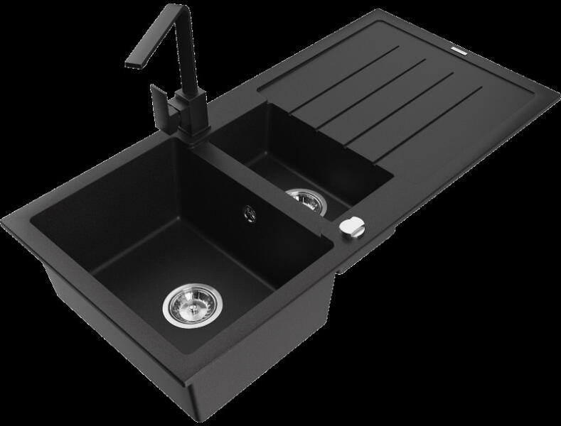 Mexen Matias, 1,5 kamrás gránit mosogató 90x50 cm-es csepptálcával Telma konyhai csapteleppel, fekete, 6502-77-670200-00 Mosogató: Termékkód: 6502901505-77 Mérete: 900x505x200 mm Kamra mélysége: 180 mm (nagyobb), 115 mm (kisebb) Kamra méretei: 435x335 mm (nagyobb), 345x150 mm (kisebb) Lefolyó átmérője: ø90 mm Típus: 1,5-kamrás, rövid csepegtetőtálcával Típus: Az asztallapba