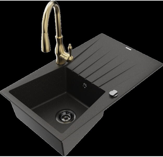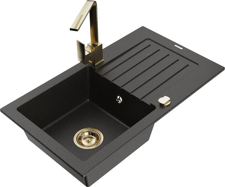 Mexen Pablo, gránit mosogató 752x436x161 mm, 1 kamrás és arany csaptelep Rita, fekete-arany metál, 6510-75-670300-50 Gyártó: Mexen Sorozat: Pablo Mérete: 752x436x161 mm Kamra mélysége: 151 mm Kamra méretei: 356x332 mm Lefolyó átmérője: ø90 mm Szín: fekete - arany metál Típus: 1 kamrás csepegtetővel Típus: az asztallapba ágyazva Anyaga: gránit (80% gránit adalékanyag 20%