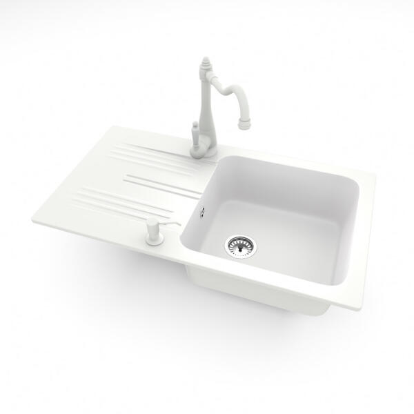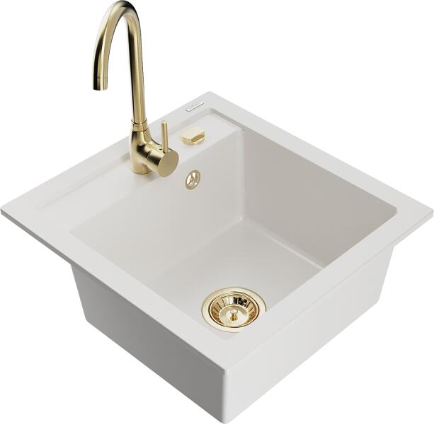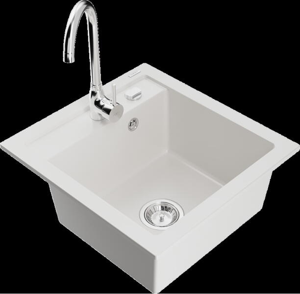 Mexen Vito, 1 kamrás gránit mosogató és Telma konyhai csaptelep, fehér, 6503-20-670200-00 Mosogató: Termékkód: 6503521000-20 Mérete: 520x490x210 mm Kamra mélysége: 200 mm Kamra méretei: 410x360 mm Lefolyó átmérője: ø90 mm Típus: 1 kamrás Típus: Az asztallapba süllyesztett Fehér szín Anyaga: gránit (80% gránit adalékanyag 20% gyanta) Túlfolyó nyílás: Igen Lyukak: (csap