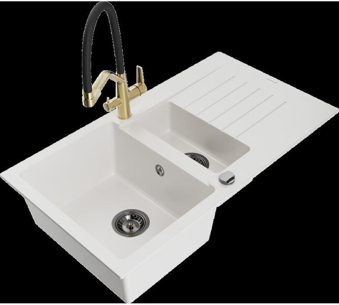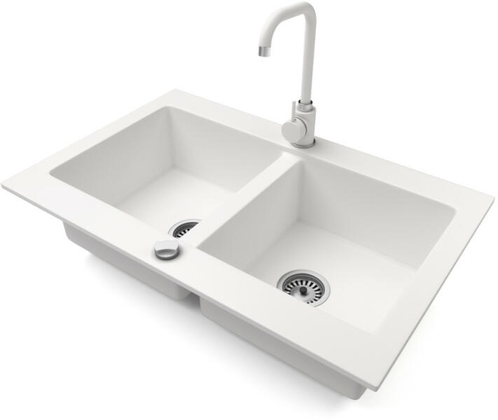 NERO Verso gránit mosogatótálca fehér színben csapteleppel és automata dugókiemelővel. Kétmedencés, szimmetrikus elrendezésű mosogató, kellően nagyméretű medencékkel, a 75 cm-es szélesség egyszerre tágas és helytakarékos is. Letisztult formatervezés, kiemelkedő anyagvastagság jellemzi, ezáltal rendkívül masszív és ellenálló konstrukció. Anyaga 80% gránit őrlemén
