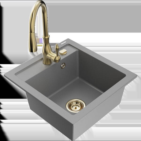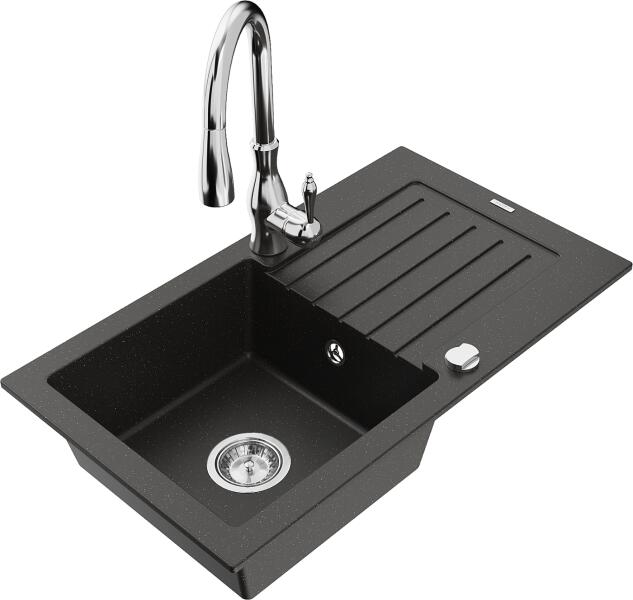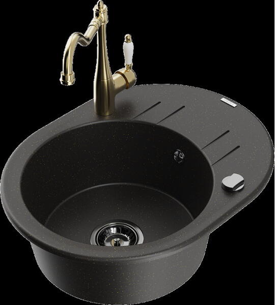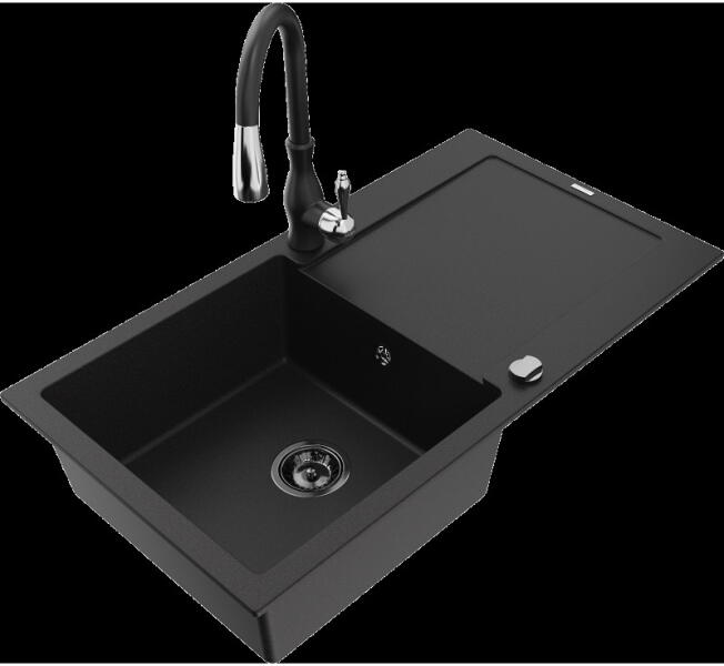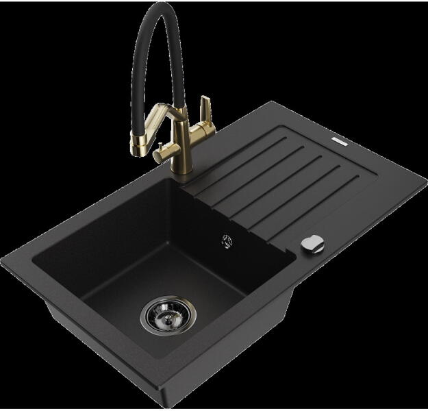 Mexen Pablo, gránit mosogató 752x436x161 mm, 1 kamrás és Savita mosogató csaptelep, fekete-arany metál, 6510-75-672601-00 Gyártó: Mexen Sorozat: Pablo Méretek: 752x436x161 mm Kamra mélysége: 151 mm Kamra méretei: 356x332 mm Lefolyó átmérője: ø90 mm Szín: fekete-arany metál Típus: 1 kamrás csepegtetővel Típus: a pultba süllyesztve Anyaga: gránit (80% gránit adalékanyag 20