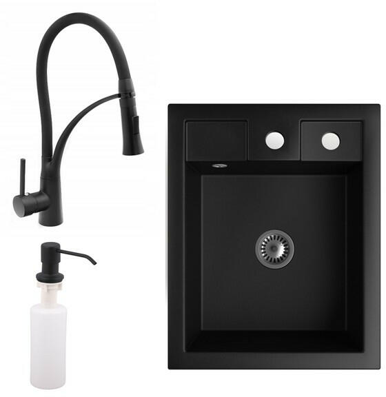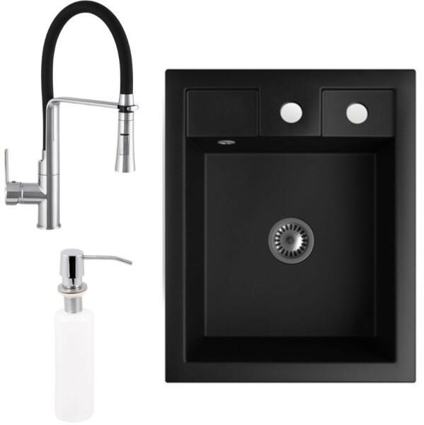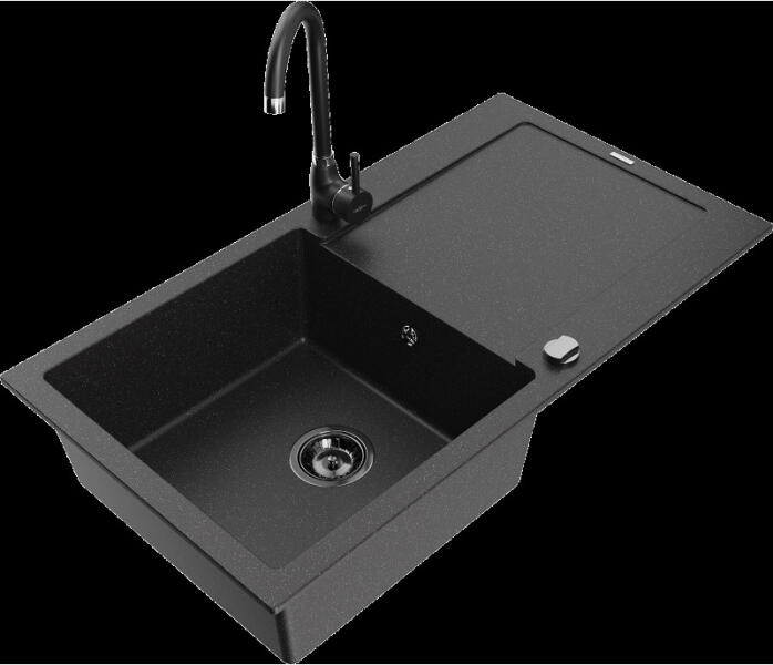 NERO Parma amely kisméretű, de mégis nagyon tágas gránit mosogató csapteleppel, szifonkészlettel és beépíthető mosogatószer adagolóval, matt fekete színben. Egyik nagy előnye, hogy már egy 40 cm széles konyhabútor elembe is beépíthető, az 50 cm-es mélysége kellő méretet biztosít. A medence mélysége is nagynak számít, 18 cm. Tökéletes bármilyen stílusú konyhába a