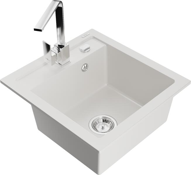 Mexen Vito, 1 kamrás gránit mosogató 520x490x210 mm, Rita króm csaptelep, fehér, 6503-20-670300-00 Mosogató: Mérete: 520x490x210 mm Kamra mélysége: 200 mm Kamra méretei: 410x360 mm Lefolyó átmérője: ø90 mm Típus: 1 kamrás Típus: Az asztallapba süllyesztett Fehér szín Anyaga: gránit (80% gránit adalékanyag 20% gyanta) Túlfolyó nyílás: Igen Lyukak: (akkumulátor, gép) 2