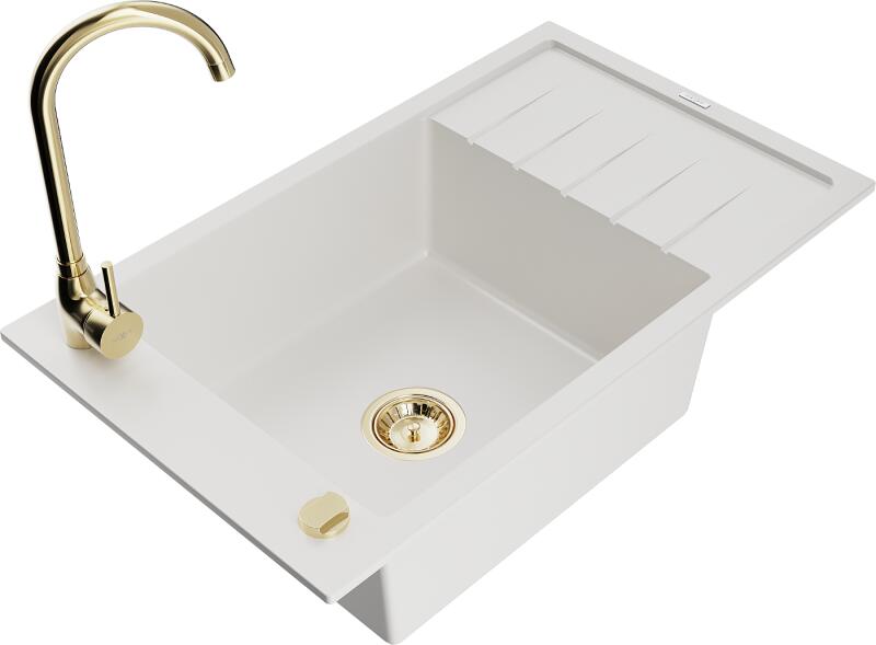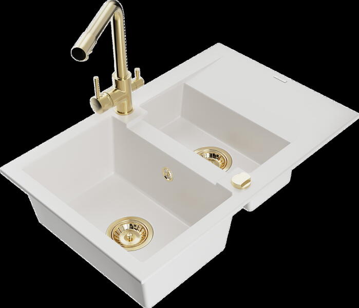 Mexen Gaspar, gránit mosogató 737x475x177 mm, 1,5 kamrás, Duero arany csaptelep, fehér, 6507-20-671600-50 Gyártó: Mexen Sorozat: Gáspár Modell: 1,5-kamrás, rövid leeresztővel Felszerelés: munkalapra Fehér szín Hossza 737 mm Szélesség 475 mm Magasság: 177 mm Kamra mélysége: 167 mm (nagyobb), 107 mm (kisebb) Kamra mérete: 395x272 mm (nagyobb), 375x182 mm (kisebb) Lefolyó átmér
