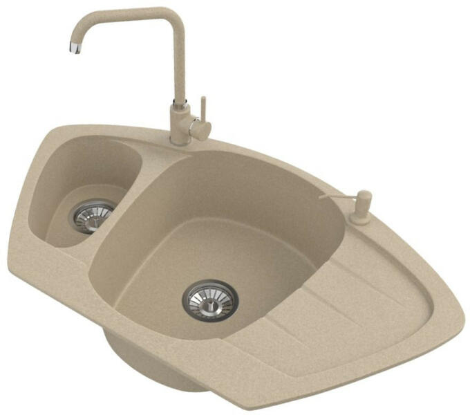 NERO Compact sarok gránit mosogató, ami egyben praktikus és impozáns látványelem is a konyhában. Tökéletes választás azokba a konyhákba, ahol a mosogató rész a sarokban lett kialakítva. Íves, de modern formatervezése nagyszerűen illik bármilyen stílusú konyhába. A mosogatón 2 lyuk lett kialakítva, egy a csaptelepnek és egy a beépíthető mosogatószer adagolónak vagy aut