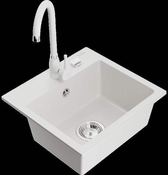 Mexen Elias, 1 kamrás gránit mosogató csepptálcával 80x48 cm, konyhai csaptelep Telma, fehér, 6511-20-670200-50 Mosogató: Termékkód: 6511791005-20 Mérete: 795x480x200 mm Kamra mélysége: 190 mm Kamra méretei: 465x420 mm Lefolyó átmérője: ø90 mm Típus: 1-kamrás, rövid csepptálcával Típus: Az asztallapba süllyesztett Fehér szín Anyaga: gránit (80% gránit adalékanyag 20%