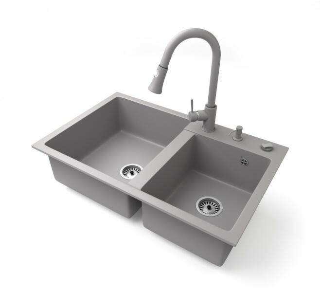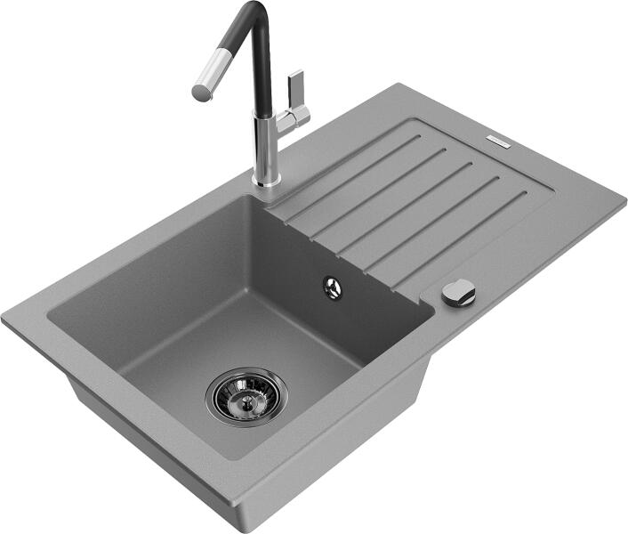 NERO Palazzo gránit mosogatótálca szürke színben csapteleppel, automata dugóemelővel és adagolóval. A kétmedencés mosogatótálcák 21. századi csúcsmodellje, ami két nagyméretű medencéjével és különleges kialakításával minden konyha tökéletes eleme lehet. Az asszimetrikus kialakításnak köszönhetően a kisebb medence fölött egy praktikus perem helyezkedik el, ahol h