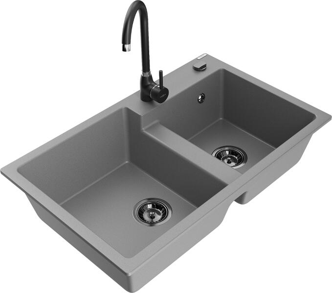 Mexen Tomas, gránit mosogató 800x500x190 mm, 2 kamrás és fekete Telma csaptelep, szürke, 6516-71-670200-70-B A konyhai mosogató műszaki adatai: Gyártó: Mexen Sorozat: Tomas Modell: 2-kamrás csepptálca nélkül Felszerelés: munkalapra Szín: szürke Felületkezelés: sima Hossza 800 mm Szélesség 500 mm Magasság: 190 mm Kamra mélysége: 180 mm (nagyobb), 180 mm (kisebb) Kamra méret
