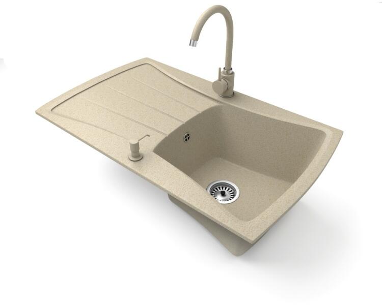 NERO Venezia gránit mosogató homokbézs színben. Egyedi és különleges formával tervezett egymedencés mosogató, kellően nagyméretű csepegtető résszel. A velencei gondolákat idéző, harmonikusan kialakított ívekkel a konyha esztétikus része, emellett anyagvastagságának köszönhetően rendkívül masszív konsktrukció. A mosogatón 2 lyuk található, egy a csaptelepnek és eg