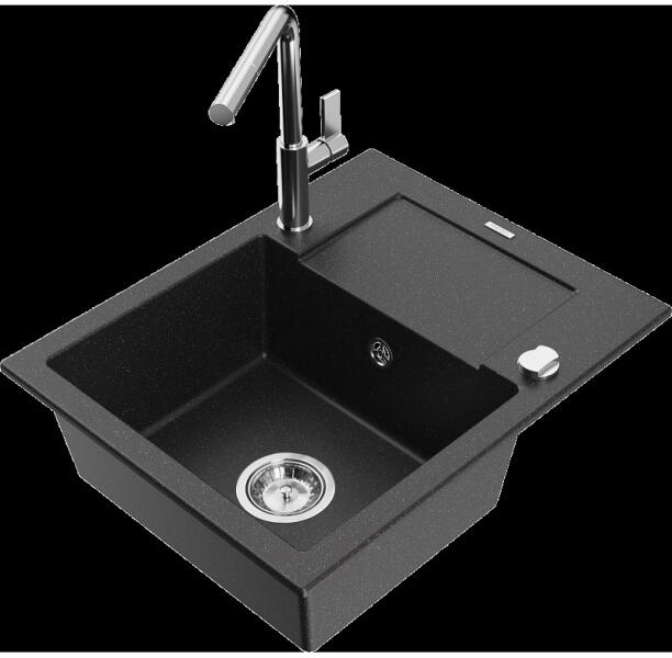 Elias konyhai mosogató, 795x480x200 mm, 1 kamrás Gyártó: Mexen Sorozat: Elias Típus: 1 kamrás, rövid csepegtetővel Méretek: 795x480x200 mm Kamra mélysége: 190 mm Kamra méretei: 465x420 mm Lefolyó átmérője: ø90 mm Beépítés: felülről a munkalapba süllyesztve Anyaga: gránit (80% gránit adalékanyag 20% gyanta) Túlfolyó lyuk: igen Lyukak: 2 (1 x akkumulátor, 1 x autom